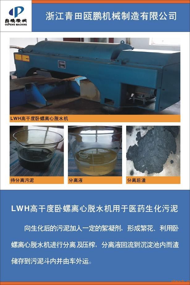 | 污泥處理系統(tǒng)的LWH高干度臥螺離心脫水機,由機架,安裝在機架上的離心機旋轉(zhuǎn)體,和由液壓馬達差速器和液壓站裝置構(gòu)成的液壓系統(tǒng)組成,所述離心機旋轉(zhuǎn)體包括轉(zhuǎn)鼓,安裝在轉(zhuǎn)鼓內(nèi)的螺旋,位于轉(zhuǎn)鼓大端上的進料裝置,所述進料裝置的進料管延伸進螺旋內(nèi),所述轉(zhuǎn)鼓設(shè)有直段與錐段,所述直段大端設(shè)有液相出口,錐段末端設(shè)有排渣口,所述轉(zhuǎn)鼓的半錐角設(shè)定為8-14°,降低了轉(zhuǎn)鼓的半錐角,可以緩解螺旋的瞬間推動力,可進一步解決由于濃度高而造成的堵料問題。