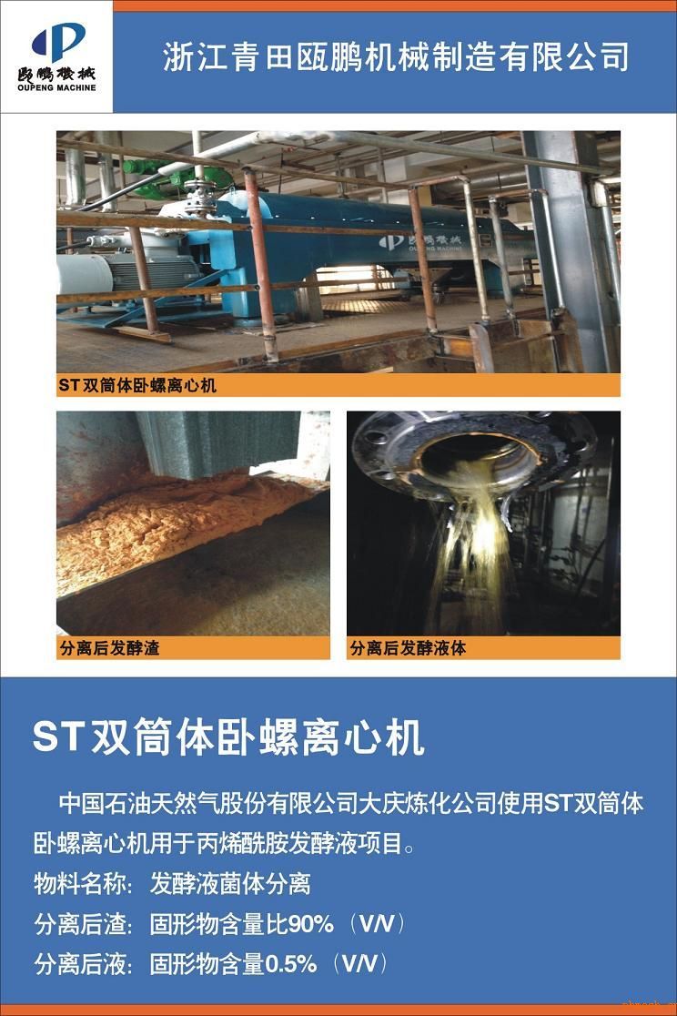ST雙筒體臥螺離心機(jī) *石油天然氣股份有限公司大慶煉化公司使用ST雙筒體臥螺離心機(jī)用于丙煉酰胺發(fā)酵液項(xiàng)目 |