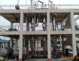 強制循環(huán)蒸發(fā)器 一、概述: 強制循環(huán)式蒸發(fā)器是物料通過大流量的循環(huán)泵輸送到列管式加熱器內(nèi),經(jīng)加熱后進入分離器蒸發(fā)分離,未蒸發(fā)的余料回流再次由循環(huán)泵輸送至加熱器加熱蒸發(fā),這樣形成了一個反復循環(huán)蒸發(fā)的系統(tǒng),廣泛應用于食品、醫(yī)藥、化工、環(huán)保等行業(yè)的水相或有機相溶液的蒸發(fā)濃縮,特別適合粘度大、易結(jié)垢、結(jié)晶物料在常壓或真空條件下間斷或連續(xù)的蒸發(fā)濃縮結(jié)晶,可以是單效或多效蒸發(fā)濃縮結(jié)晶。 二、使用范圍: 強制循環(huán)式蒸發(fā)器適用于有結(jié)垢性、結(jié)晶性、熱敏性(低溫)、高濃度、高粘度并且含帶顆粒的不溶性固形物等物料的處理,是各種果漿(番茄醬)、玉米浸泡水、無機鹽(硫酸銨、氯化鈉等)、麥芽煳精、淀粉糖、葡萄糖、Vc、賴氨酸、低聚糖、肌醇、蛋白肽等熱敏性物料的濃縮的理想設備。 三、系統(tǒng)組成: 各效蒸發(fā)器、各效分離器、冷凝器、循環(huán)泵、轉(zhuǎn)料泵、真空及排水系統(tǒng)、分氣缸、操作平臺、電器儀表控制柜及閥門、管路等系統(tǒng)組成。 四、設備特點: 1、全套系統(tǒng)設計合理美觀、運行穩(wěn)定、高效節(jié)能,蒸汽耗量低; 2、濃縮比大,強制循環(huán)式使粘度較大的料液容易流動蒸發(fā); 3、特殊設計經(jīng)簡單操作可實現(xiàn)切換改效,以適應不同產(chǎn)品的生產(chǎn); 4、蒸發(fā)溫度低,熱量得到充分利用,料液受熱溫和,適用于低溫熱敏性物料的濃縮; 5、蒸發(fā)器通過強制循環(huán),在管內(nèi)受熱均勻,傳熱系數(shù)高,可防止干壁現(xiàn)象; 6、料液進入分離器再分離,強化了分離效果,使整體設備具有較大的操作彈性; 7、整套設備結(jié)構緊湊,占地面積小,布局簡單流暢,易于清洗; 8、連續(xù)進出料,料液液位及濃度可實現(xiàn)自控; 五、技術參數(shù):