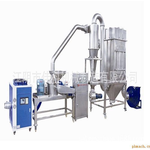 WFJ-15型超微粉碎機(jī)經(jīng)進(jìn)料口螺旋送料器,將物料送入機(jī)體與導(dǎo)流圈之間的粉碎室,在粉碎室內(nèi)被高速旋轉(zhuǎn)的刀片沖擊下,使物料甩向固定在機(jī)體上的齒圈,造成撞擊、剪切,以及物料與刀片、齒圈間的相互碰撞、摩擦、剪切進(jìn)行交替粉碎。粉碎后的物料,在負(fù)壓氣流的拉力作用下,小粉粒克服自重,隨氣流越過(guò)導(dǎo)流圈,進(jìn)入分級(jí)室。分級(jí)葉輪由葉片組成,高速旋轉(zhuǎn)的葉片產(chǎn)生與負(fù)壓相反的離心力,沉入葉道內(nèi)的粉粒同時(shí)受到負(fù)壓氣流的向心力和粉粒自重及葉輪產(chǎn)生的離心力的作用,粉粒中大于臨界直徑(分級(jí)粒徑)的顆粒因質(zhì)量大,被甩回粉碎室繼續(xù)粉碎,小于臨界直徑的顆粒經(jīng)排粉管進(jìn)入旋風(fēng)收集器經(jīng)排料閥排出。分級(jí)葉輪的旋轉(zhuǎn)速度越高,分級(jí)的粉粒越細(xì),調(diào)正分級(jí)葉輪的旋轉(zhuǎn)是控制粉粒大小的決定因素。