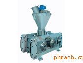 粉狀物料通過(guò)定量送料器被定量,均勻地加入軋片主料斗內(nèi)的縱向保持恒定的料位,然后由軋片主料斗內(nèi)的縱向錐螺旋對(duì)粉料進(jìn)行預(yù)壓縮并輸送至兩只軋輥的弧形槽口;兩只軋輥表面均勻分布形狀相同的半扁圓形弧槽或圓坑,通過(guò)一對(duì)齒輪的嚙合傳動(dòng),使兩只軋輥等速,反向旋轉(zhuǎn),將錐螺旋輸送至槽口的物料帶入槽內(nèi)或圓坑內(nèi),并瞬間強(qiáng)制壓縮,物料經(jīng)壓縮成形后承受的壓力逐漸減小,在其彈力及重力作用下,從槽內(nèi)或圓坑內(nèi)脫落,進(jìn)入破碎,整粒系統(tǒng),然后根據(jù)用戶(hù)的粒度要求過(guò)篩,分級(jí),得到符合質(zhì)量要求的均勻顆粒狀產(chǎn)品.篩下粉重新返回定量加料器循環(huán)利用.