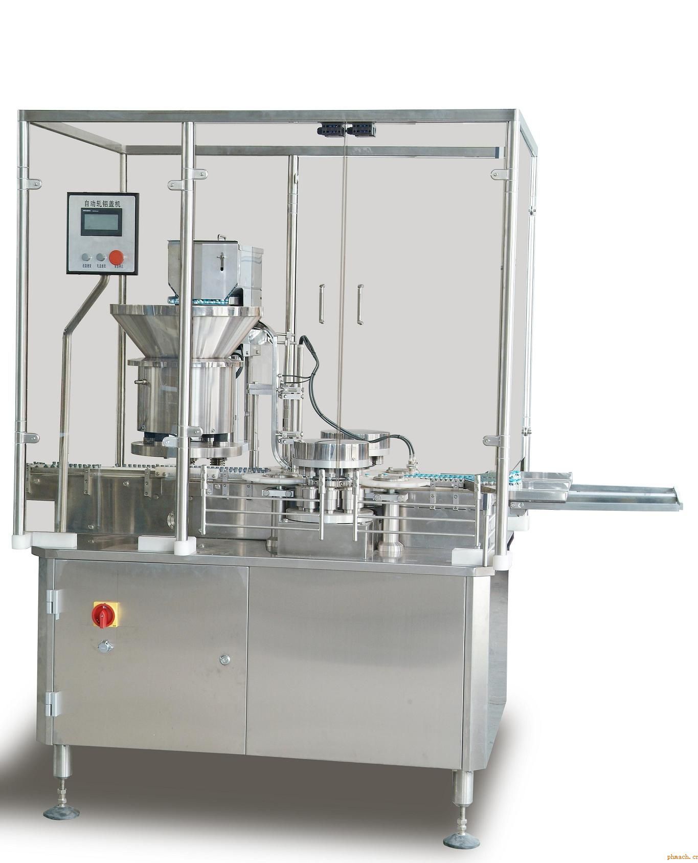 GKZD500軋鋁蓋機 軋鋁蓋機采用國外先進(jìn)技術(shù),具有機構(gòu)設(shè)計獨特,制造精良,高效快速,噪音低等特點。具有速度快,破損率低,鋁蓋軋蓋部位外形美觀等優(yōu)點。適合各藥廠單機或配套連線使用。 本機采用雙軌形式,有2個軋蓋工作站同時工作,速度快且性能穩(wěn)定,還具有變頻調(diào)速,自動供蓋控制和自動計數(shù)等功能。