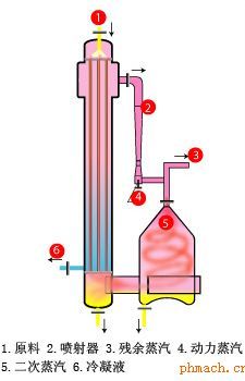 | 從分離器出來的二次蒸汽一部分在高壓工作蒸汽的帶動下進(jìn)入噴射器混合升溫升壓后進(jìn)入加熱室當(dāng)作加熱蒸汽使用,來加熱料液。另一部分進(jìn)入冷凝器,冷凝后排出。加熱蒸汽在加熱室中凝結(jié)成水排出。管內(nèi)溶液在加熱蒸汽的加熱下蒸發(fā)濃縮,達(dá)到要求后排出。